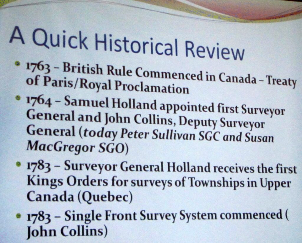 Our speaker was Mr. Nigel Day, OLS, OLIP, Head of the Geomatics Section at the Ministry of Transportation, Eastern Region, who gave a most interesting talk about early surveying of the lands pre Loyalist settlements.
