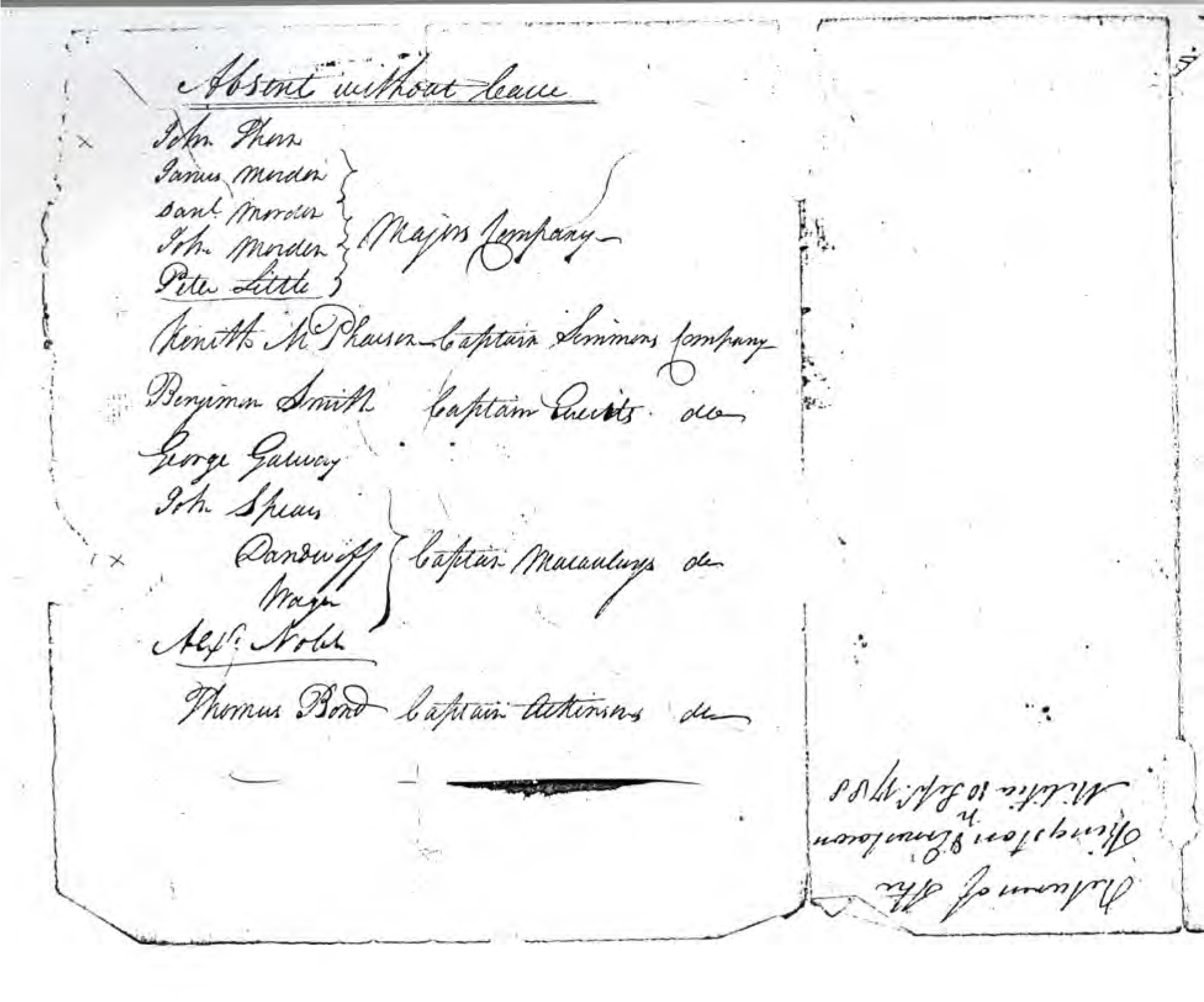 Absent without leave: John Thorn, James Morden, Dan’l Morden, John Morden, Peter Little – Major’s Company Kenith McPherson – Captain Simmons Company Benjamin Smith – Captain Everits do [“do” for “ditto”, for “company”]