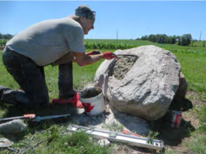 First they had to locate and move to the plot a suitable stone on which to mount the plaque. Then they had to locate a foundry to cast the bronze plaque; this entailed three trips from Kingston to Merrickville. Once the plaque was made, they had to hire a stone mason to mount the plaque.
