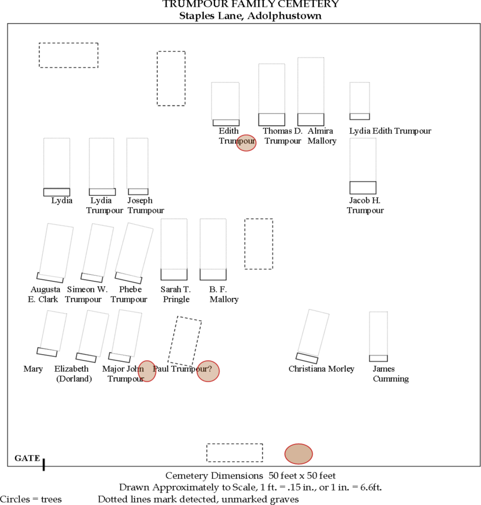Who else might be buried there? Well, since the Paul Trumpour household numbered 17 in 1806, according to one record, there are lots of candidates. Not all 17 were immediate family. Paul and Deborah had 7 children, so presumably some of the other eight were hired hands; four (I am going by memory on the number) were slaves. All these would be possible candidates for occupants of the newly identified graves.