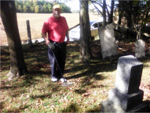 Bill Cowan is an avid historian, particularly interested in family and local history. I was delighted when he agreed to accompany me on a visit to the cemetery, as it is one he had not seen before. He shared my dismay at seeing the dilapidated condition of the grave monuments. Two had sunken so far into the ground that the tilt had toppled the upper portions onto the ground beside them. Another lay flat on the ground on its back, and was filled with water. Others were broken off and prone. We vowed to return and attempt some minor restoration. In addition, Bill suggested we bring along his metal detector, in an attempt to see if we could identify other gravesites in the open areas of the cemetery, reasoning that even old coffins would have needed metal reinforcing at the corners, handles at the ends, and so forth.