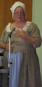 Nancy Cutway, dressed in her handwoven linsey-woolsey mantua (dress) with cotton petticoats, shift and cap, spoke about the experience of making the fabric back in 1983-84, leading up to the Loyalist Bicentennial held here in Kingston. As an inexperienced weaver at the time, she made several mistakes but imagines that similar experiences might have been encountered by Loyalist women who suddenly had to learn how to weave when they no longer had access to established weavers in their towns, when they had to leave their homes in the former Thirteen Colonies.