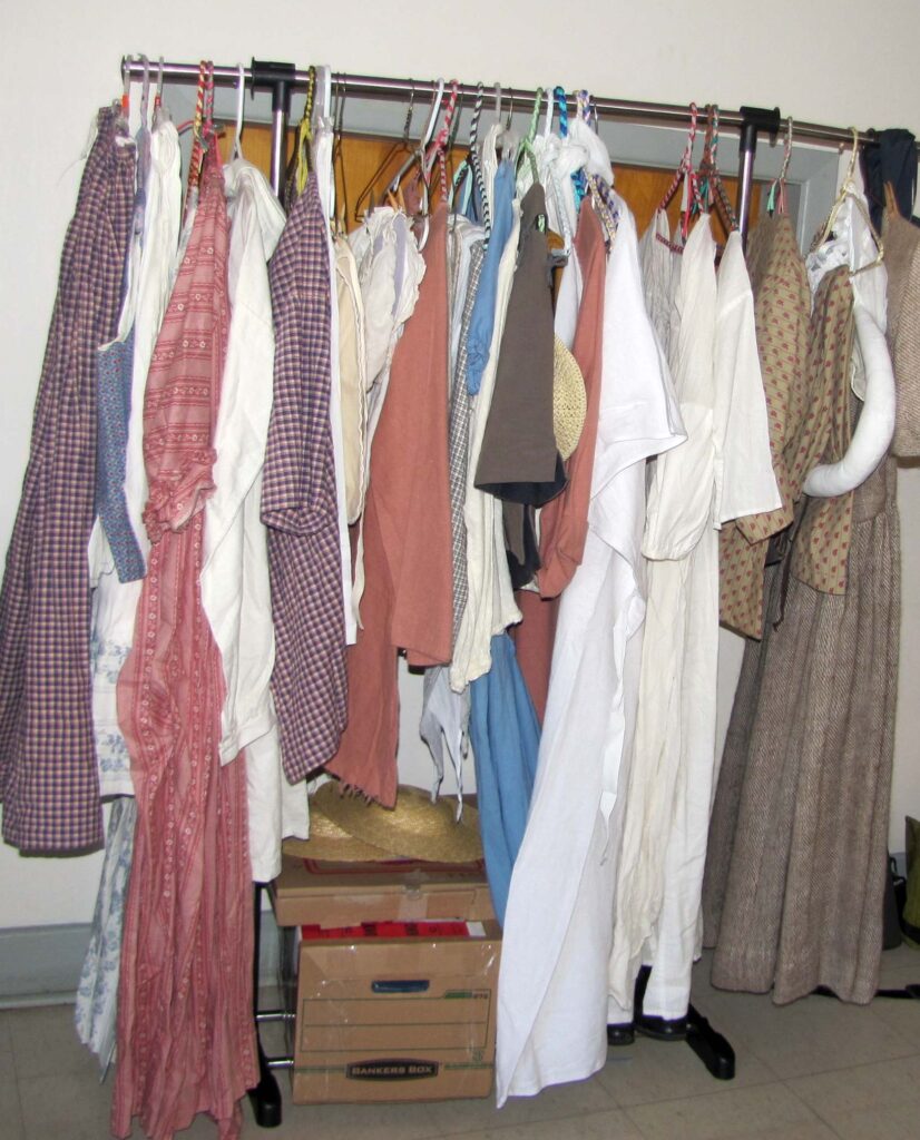 [Above] An assortment of Loyalist women’s clothing, thanks to Anne Redish and to the UELAC Costume Branch at Dominion Office. The “Costume Branch” is no longer active, but the garments still exist.