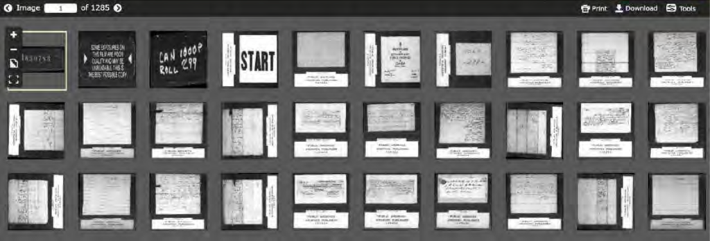 Yes, you still need to work your way to the exact page you want – but unlike the LAC site, you still start at the beginning of the film but you get to see 30 thumbnails at once. I picked one near the bottom right of the first screen, to see what bundle I was at. Enlarging it to readability (clicking on the + symbol at the top left corner of the page) told me I was at bundle W3 ref 74. I jumped ahead 100 pages (typing 130 in the image number box) and found I was still in Bundle W3. Another 200 pages landed on Bundle W4 #9. Platt’s petition was on page 478. I could enlarge the pages and move around much more easily than on the LAC version.