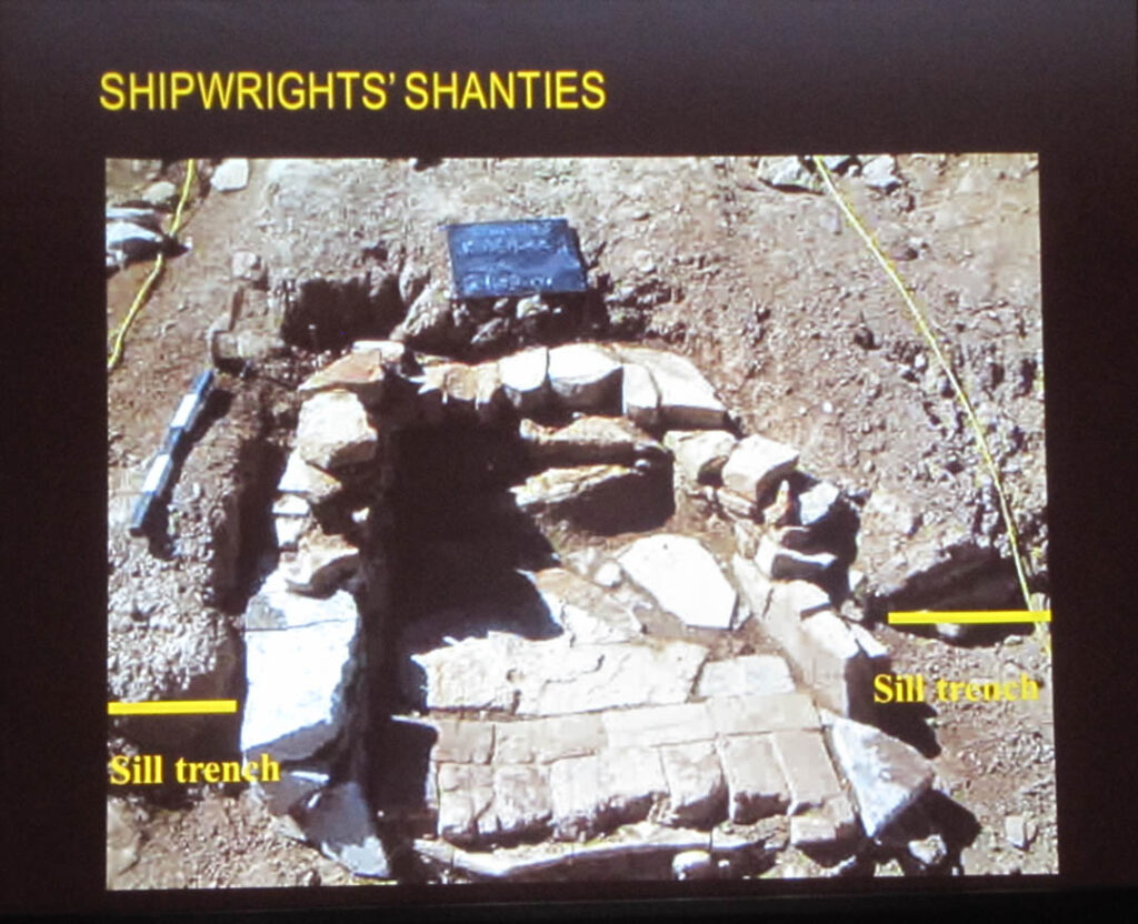 Sue Bazely, well-known archaeologist, spoke on Provincial Marine to Royal Navy: Archaeological Evidence of the War of 1812 at Kingston’s Naval Dockyard Sue pointed out that beginning in 1783, settlement of the Loyalists was concentrated along the St. Lawrence River, Lake Ontario and the west side of the Niagara River. There was a severe shortage of commercial ships available to move the Loyalists around and facilitate trade, so the Provincial Marine and their ships, stationed in Upper Canada after the American Revolution, were used for commercial transit to alleviate the shortage. The Provincial Marine was based at Carleton Island until 1789, when merchants lobbied for it to move to Kingston, to Point Frederick. By 1790 the Naval Dockyard was established. Four large gunships were built there between 1800 and 1812.