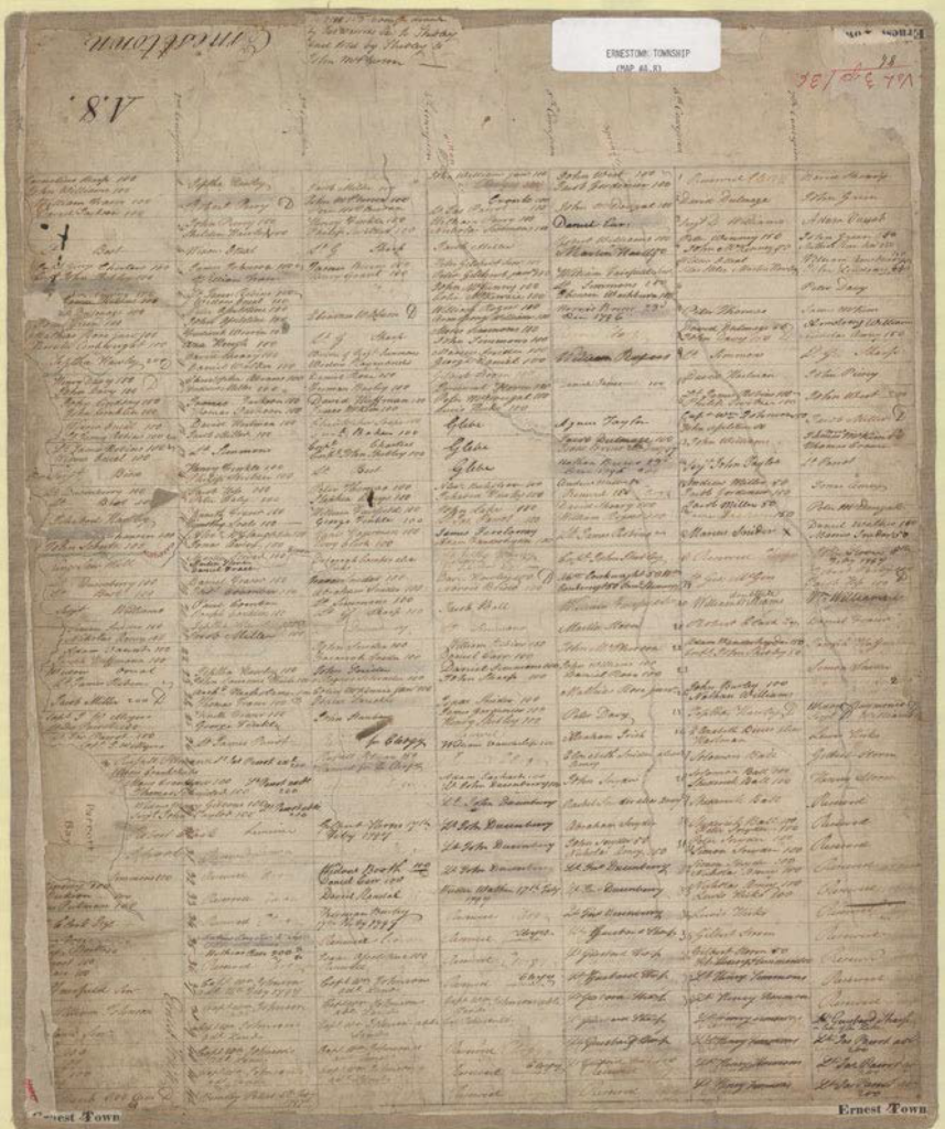 Thus, Ernesttown Township (as it was first known, since it was named for King George III’s fourth son, Prince Ernest Augustus: the second “t” eventually disappeared) was assigned to officers and men of Jessup’s Rangers. It seems that the patent map was drawn up while they were still in Quebec over the winter of 1783-84, before they undertook the arduous trek west to Lake Ontario.