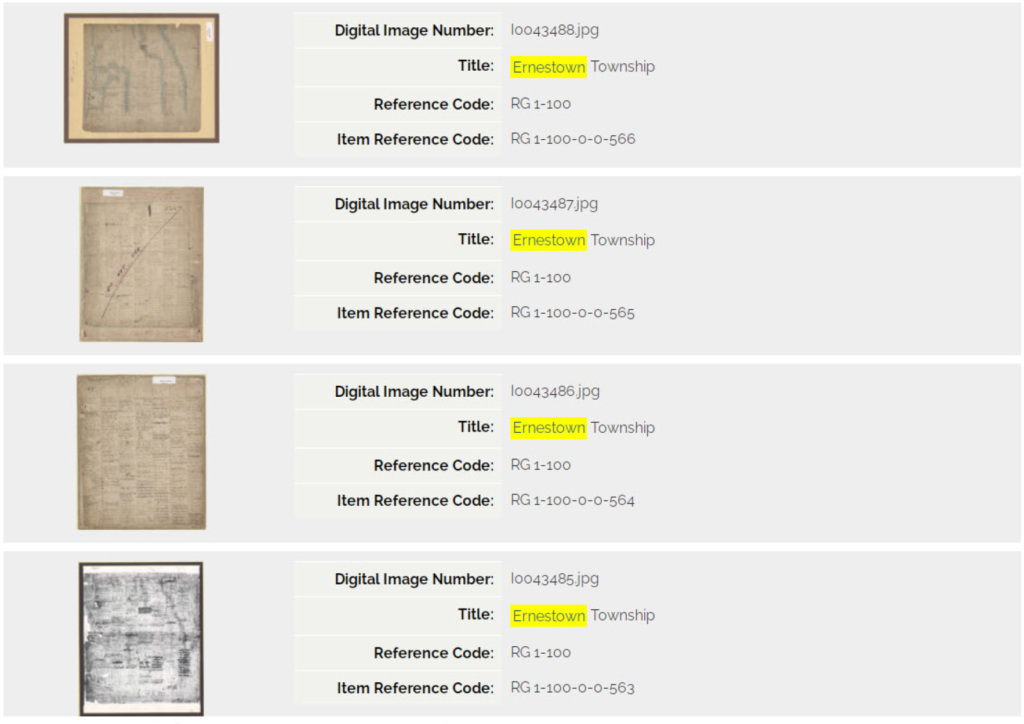 To find a Patent Map for anywhere in Ontario, go to http://www.archives.gov.on.ca/en/about/patent-plans.aspx. Richard found his map from that page by entering “Ernestown” as a keyword in the Archives of Ontario Visual Database search box. The result was: