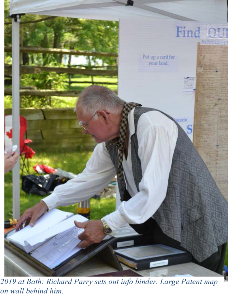 Back to Richard’s 2019 project… to obtain information on every Loyalist named on the Ernesttown Patent map. He wanted to be able to look up land and people quickly when someone came to the branch’s booth, so after filling binders with more detailed information on each man named on the map, he generated two indexes: one organized by Surname, linking the name to the Lot and Concession; and one by Concession/Lot number, referring to Surname. He spoke with many visitors to the booth that day, some descended from Loyalists who were delighted to find their surname in his binders, others who wondered who had first been given the lot on which they now live. Since that time, Richard has placed four copies of these binders at locations accessible to members of the public: Kingston Frontenac Public Library (Central Branch), Lennox & Addington County Museum and Archives, the Bath Museum, and the Loyalist Research Centre at Adolphustown.